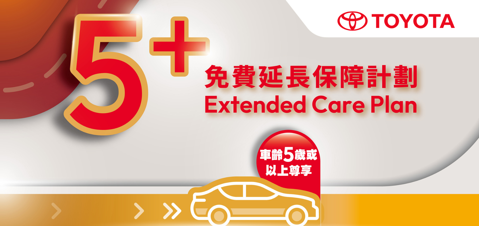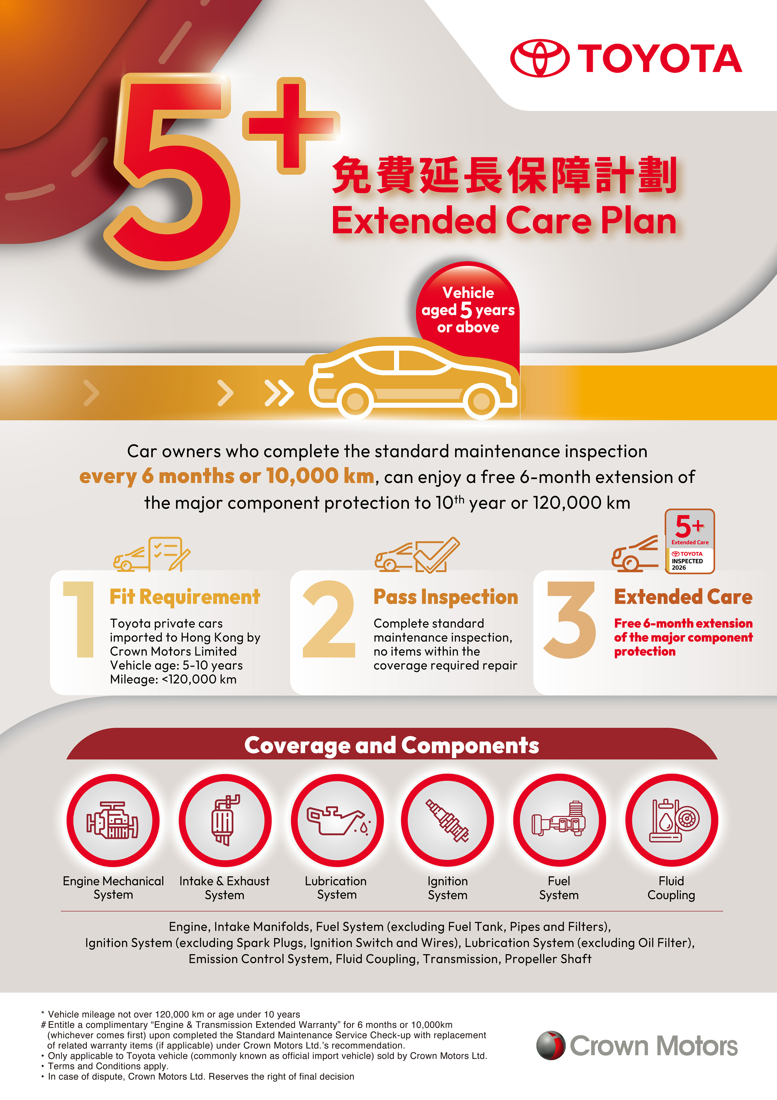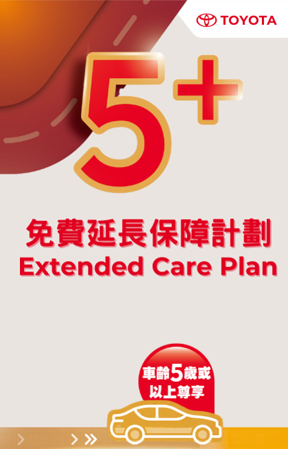 As long as your vehicle is a Toyota private car imported to Hong Kong by Crown Motors Limited, is 5-10 years old, and has less than 120,000 km, your car can once again receive original extended care on key components.